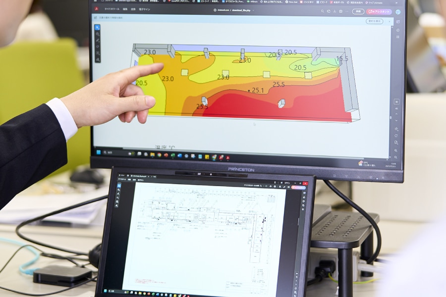 TAKEUCHIの「気流シミュレーション」では、温度分布、気流の流れ、二酸化炭素濃度を可視化し、現状の課題と改善後の効果を比較できます。さらに、運用コストの試算も可能なため、過剰な設備投資を抑制し、将来的なランニングコストまで無駄のない設計を実現します。